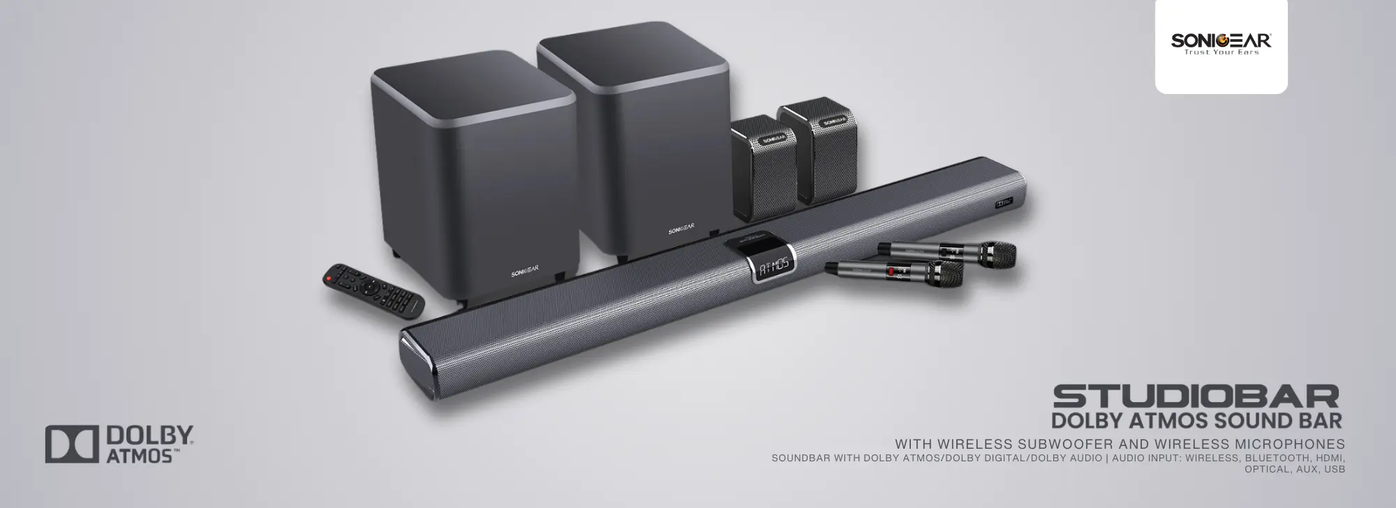 STUDIOBAR DOLBY ATMOS SOUND BAR WITH WIRELESS SUBWOOFER AND WIRELESS MICROPHONES SOUNDBAR WITH DOLBY ATMOSDOLBY DIGITALDOLBY AUDIO AUDIO INPUT WIRELESS, BLUETOOTH, HDMI, OPTICAL, AUX, USB